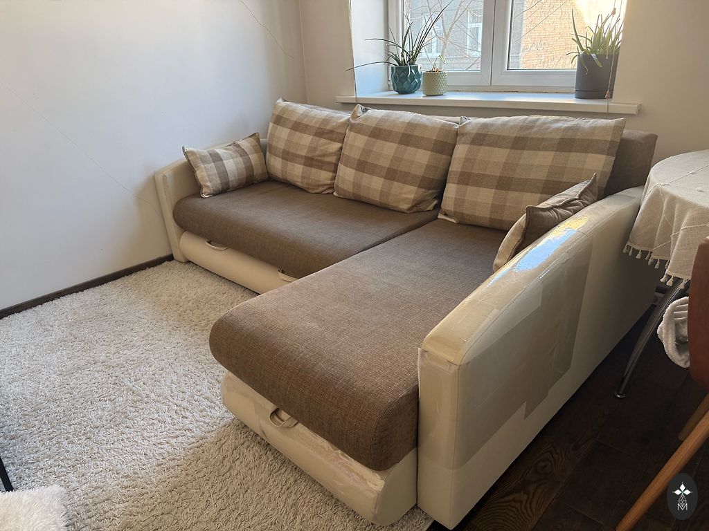 Ištraukiama sofa su dviem kubiniais krėslais, komplektas. Matomi trūkumai. Savarankiškas išvežimas.