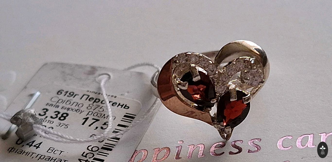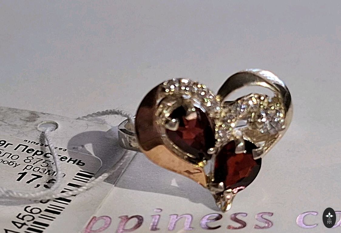 Jauns, kastītē. Sudrabs 925 prove. Granāti, cirkoniji. Izmērs 17,75.