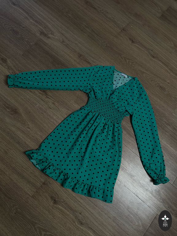 Kleita ir skaistā, tumšizaļā meža krāsā. Pievienotā vilna nodrošina siltumu.