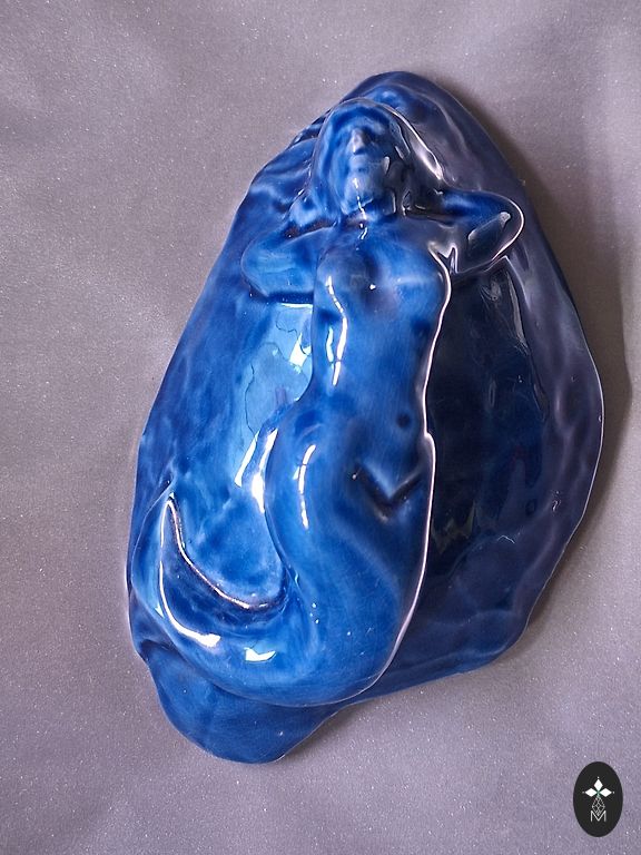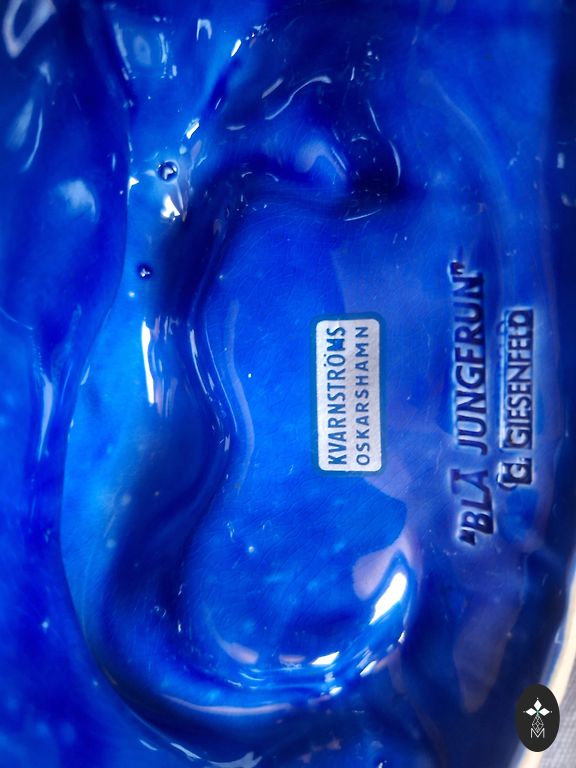 Dizains: Minimālistiskas zilās līnijas, kas akcentē figūras formas. Uz pamatnes ir ražotāja zīmogs.