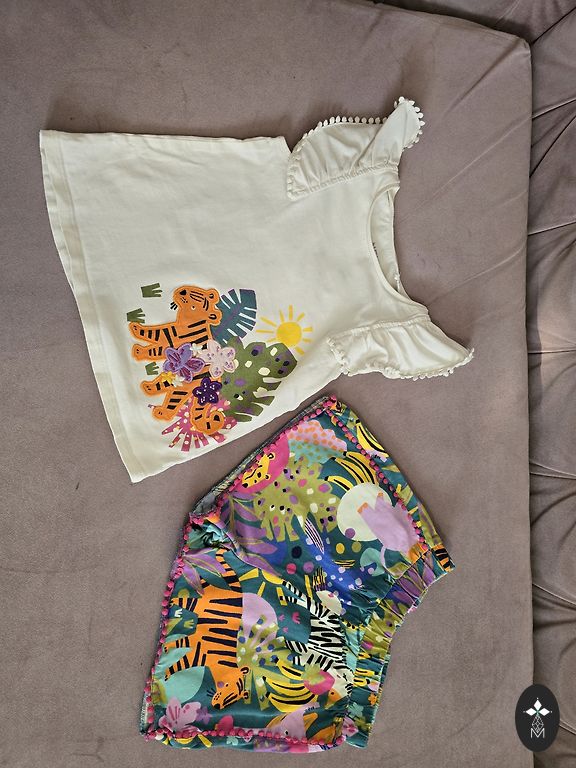 Parduodu Next formos komplektuką. Minkšta, švelni medvilnė. Šortukai yra mažesni, nes Next firmos šortai yra per dideli. Netinka dydžiui. Jie geriau tiks 110 dydžiui. Viršutinis drabužis yra vienu dydžiu didesnis, 110 cm arba 4-5 metai. Po vieno vaiko. Be dėmių ir skylių!