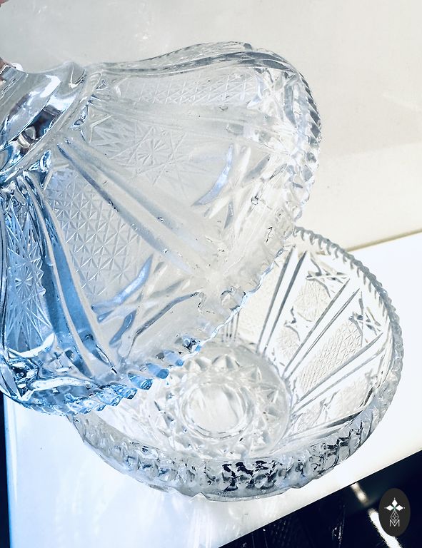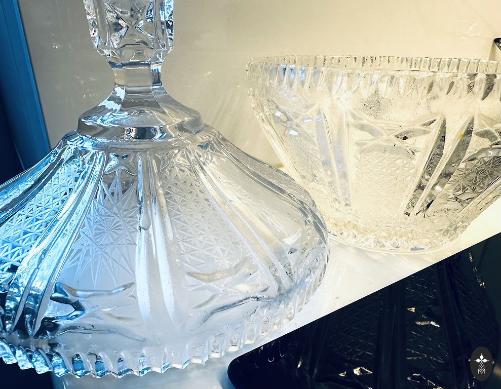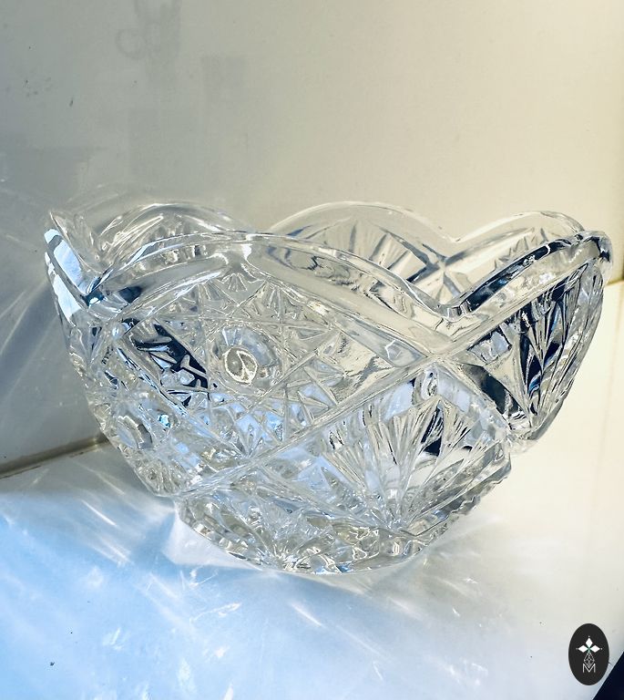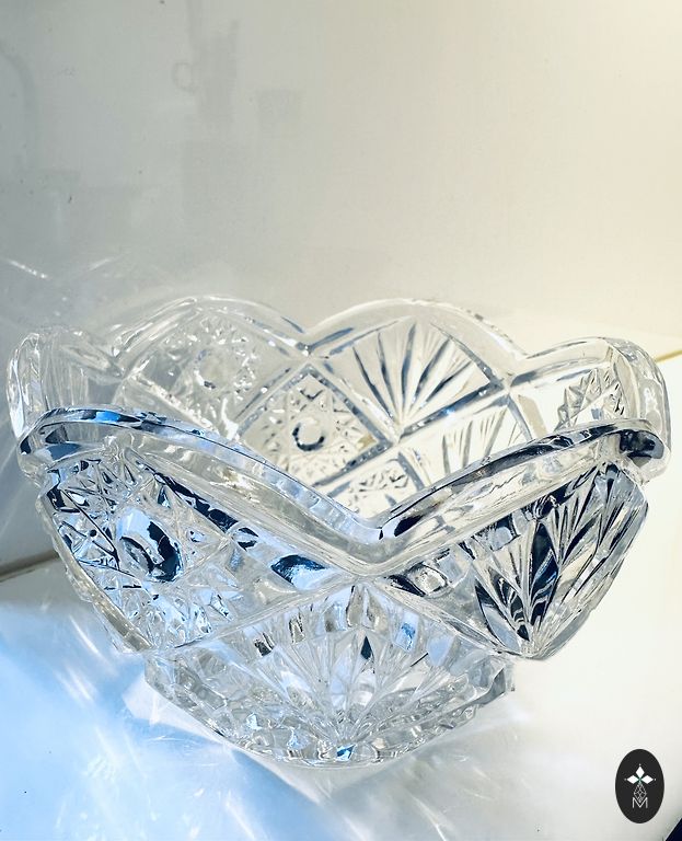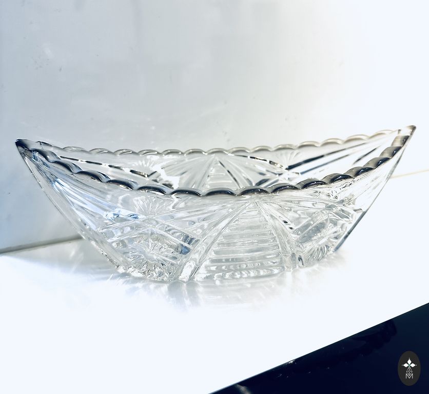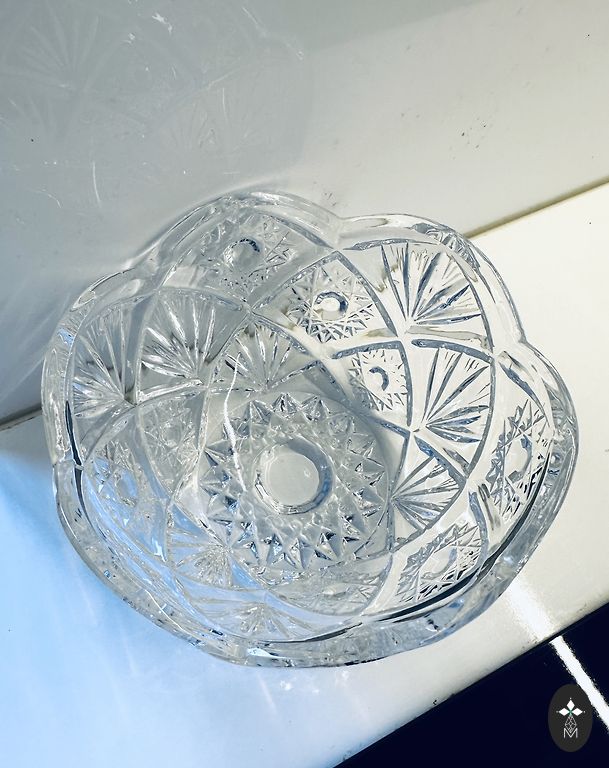 Balts porcelāns ar ģeometrisku ornamentu sarkanbrūnos, melnos un pelēkos toņos, zeltījums gar maliņu. Stāvoklis ļoti labs – bez plaisām un šķembām, zeltījums saglabājies. Ražotāja zīmogs nav redzams.