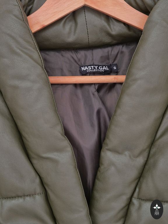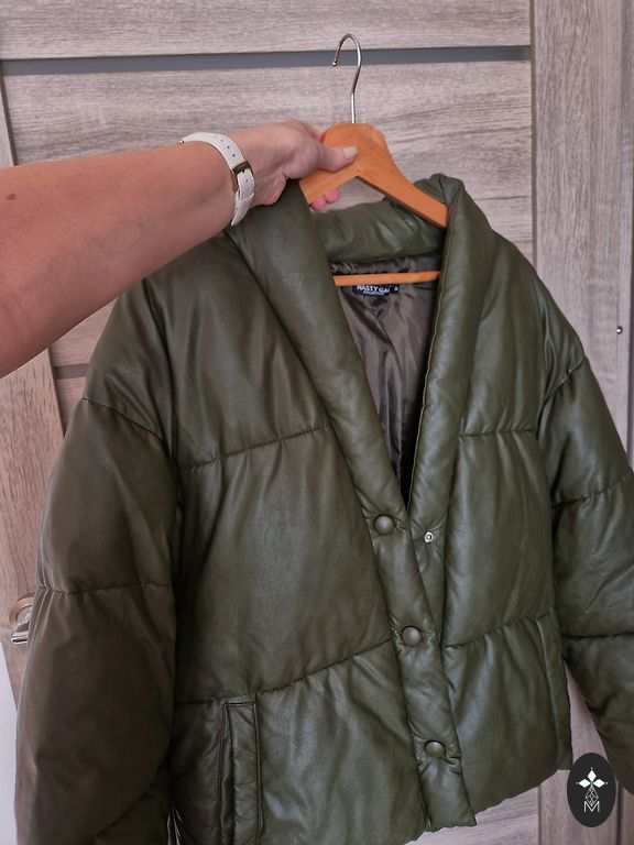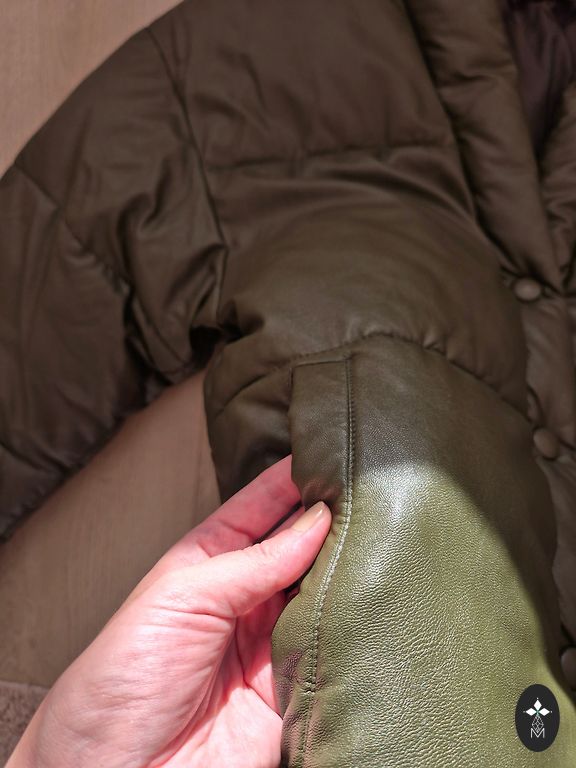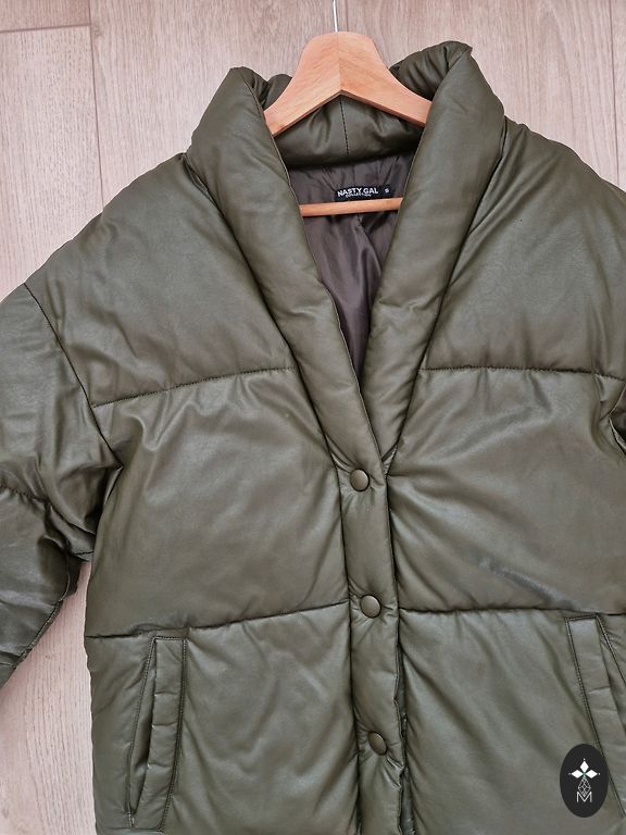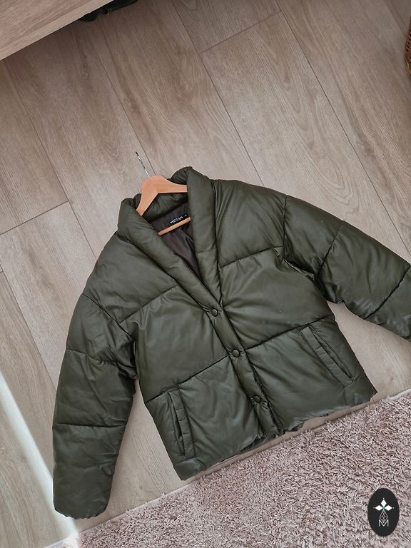 Ilgis 60 cm, krūtinės apimtis 48x2, rankovė 62 cm. Pūkinė striukė. Gaubtas, kišenės. Rankovėje yra nedidelis defektas, nuotrauka pridedama.