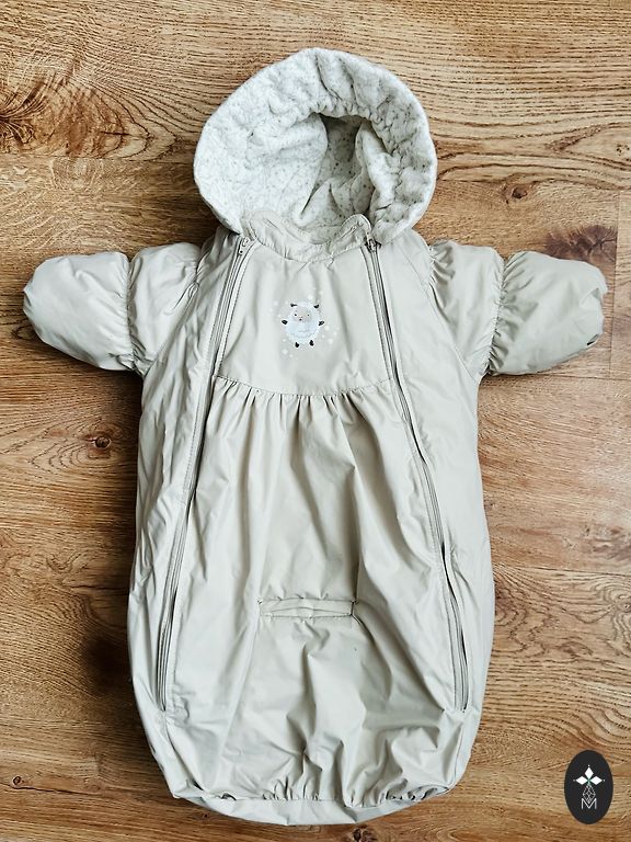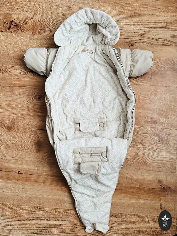 Beige winter, cool autumn/spring jumpsuit. The ends of the legs and arms have fold-over places. The baby was comfortable because of the loose fit.