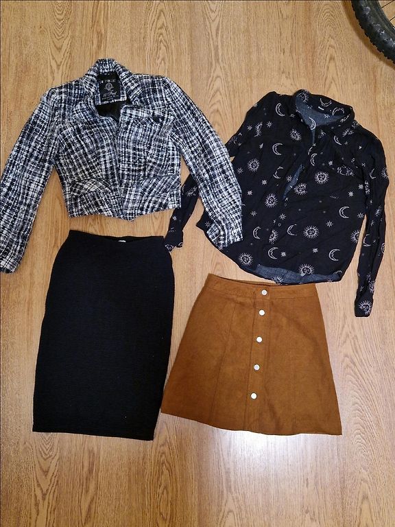 Pārdodu 3 simpātiskus īsus svārkus, kleitu ar jostiņu un džinsa jaku. Viss nēsāts ļoti maz, kkas tikai vienreiz.