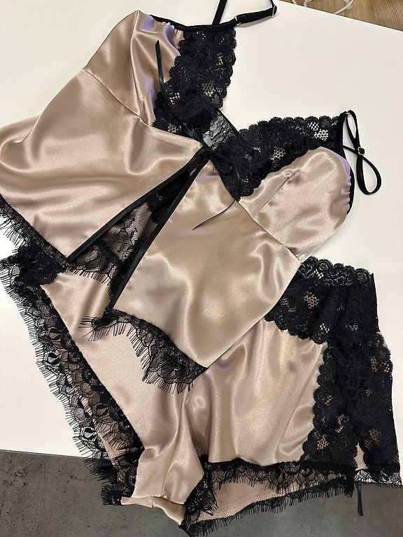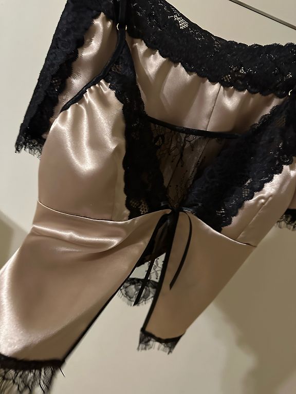 Loose-fitting model in a rich bluish-black tone, black lace