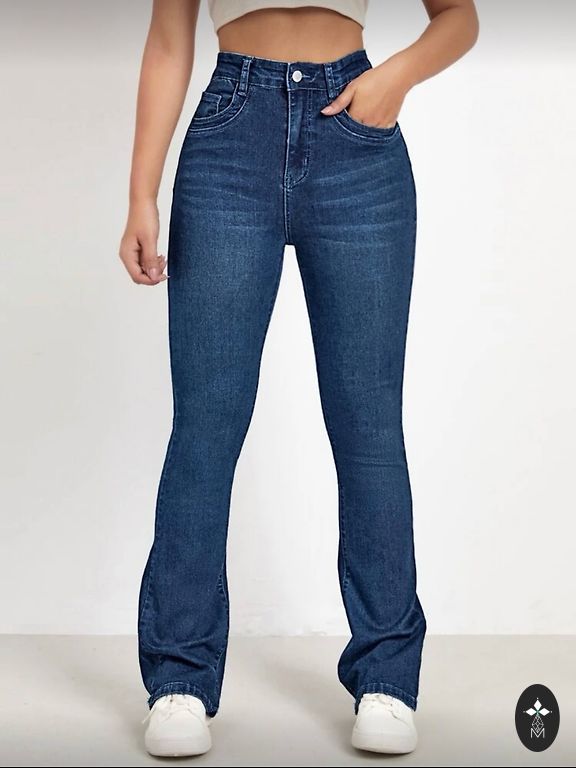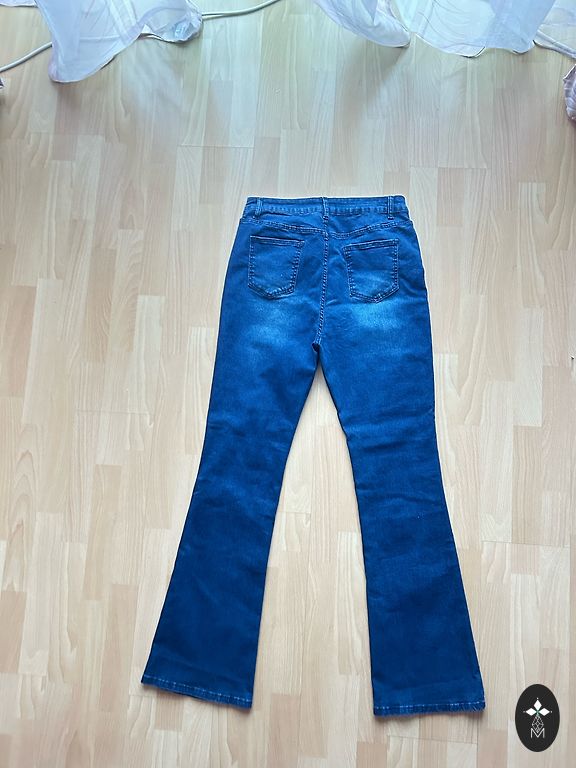 Klassikalised keskmise sinise tooniga teksapüksid, millel on meelitavalt laienev säär. Puusadelt ja reitelt liibuvad, alates põlvest allapoole laienevad, et saavutada ajatu 70ndatest inspireeritud siluett. Väga lihtne kombineerida tossudega vabaaja välimuseks või kontsadega pidulikuma riietuse jaoks.