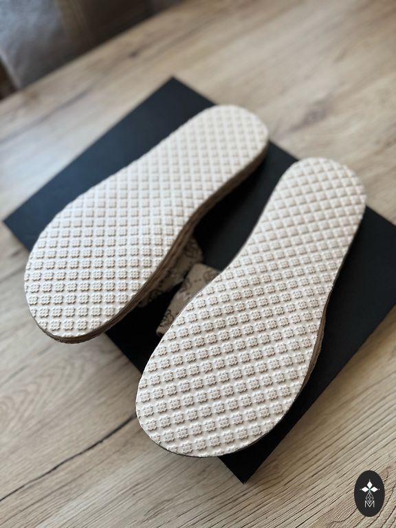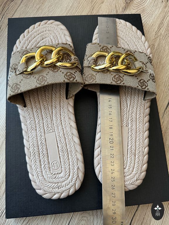 Viegli un ērti slipperi.Izmērs atbilst EUR 39/40, ar iekšpēdas garumu 26.5 cm;zoles platforma-(1.5 cm).Tie nav šauri, tie atbilst normālam augumam.Jauni.Labi deres gan ikdiena, gan pludmale.