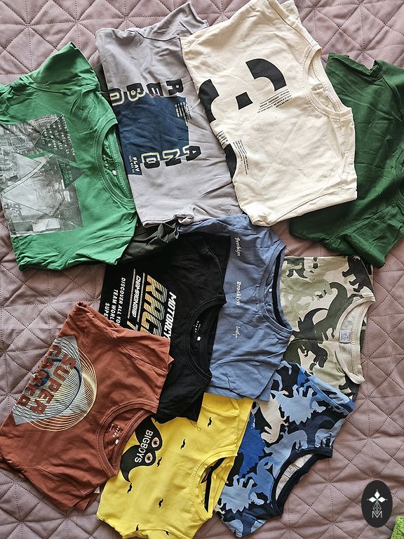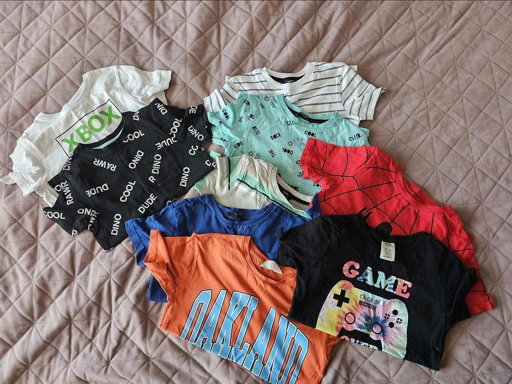 Parduodu visus drabužius, matomus nuotraukose. Visi marškinėliai ir megztiniai yra geros būklės. Dėvėti mažai ir retai, nes vaikas greitai augo. Drabužiai yra švarūs ir paruošti perduoti naujam savininkui.