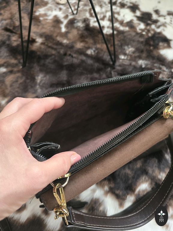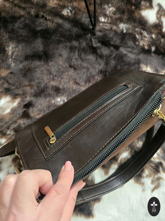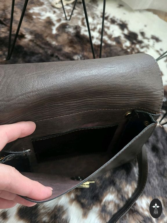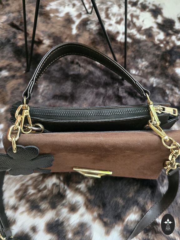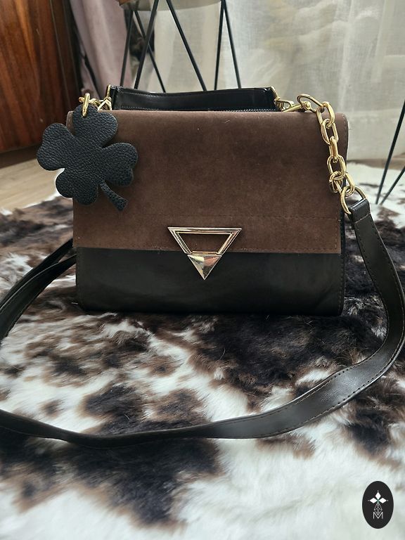 Lengvai žals rankinė su aukso spalvos užsegimu ir peties dirželiu.