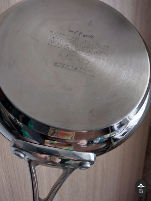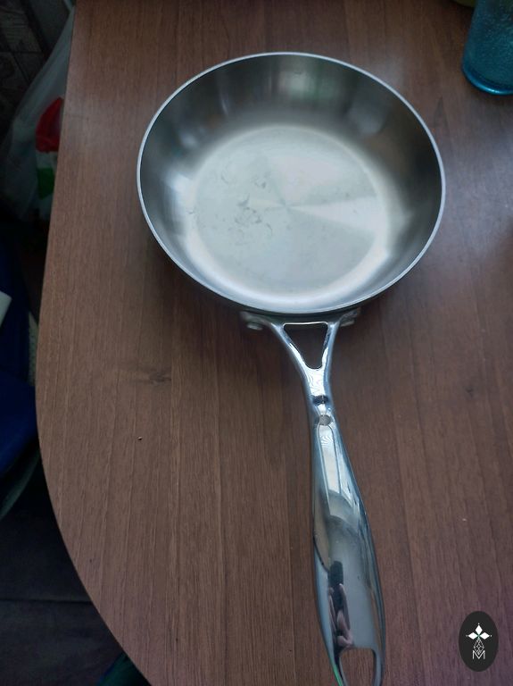 Kvalitatīva panna ar vāku ,ļoti pasmaga.Manuprāt tā arī nav bijusi lietota,stāvēja plauktā.D 24 cm augstums bez vāka 8 cm.