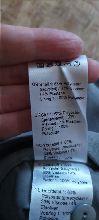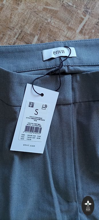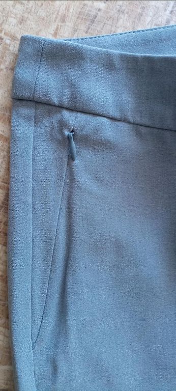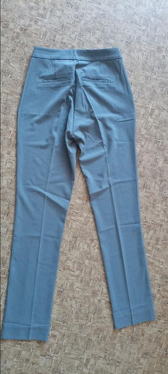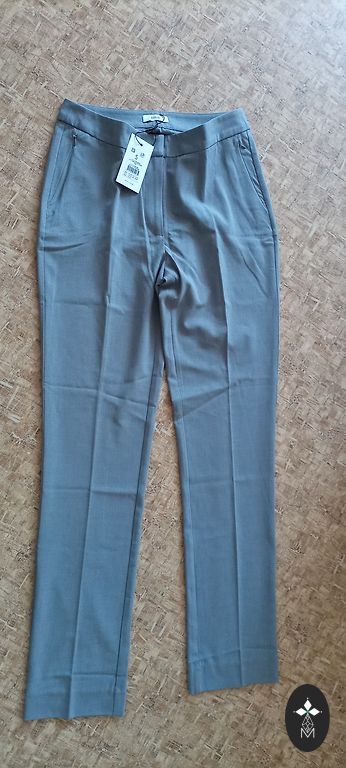 Augsta jostasvieta, komplektā ar jostu, ir kabatas, ar ielocēm. Taisns piegriezums. Viduklis 39x2, gurni 54x2, garums 116 cm. Spānija. Bikšu garumu var pacelt ar uzlocījumu.