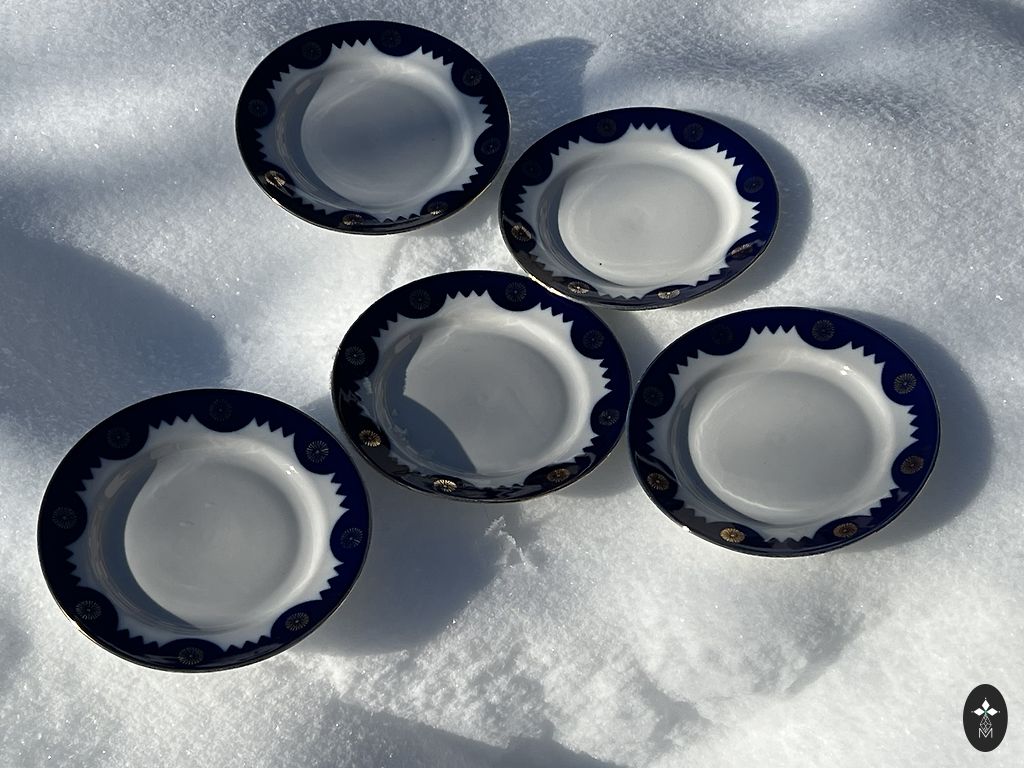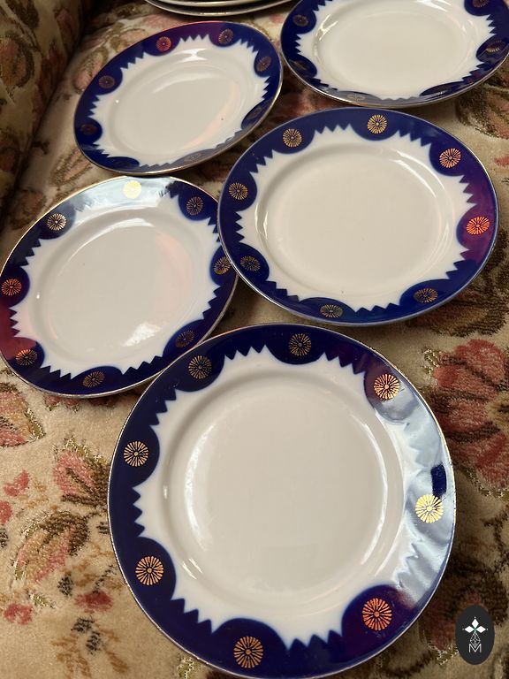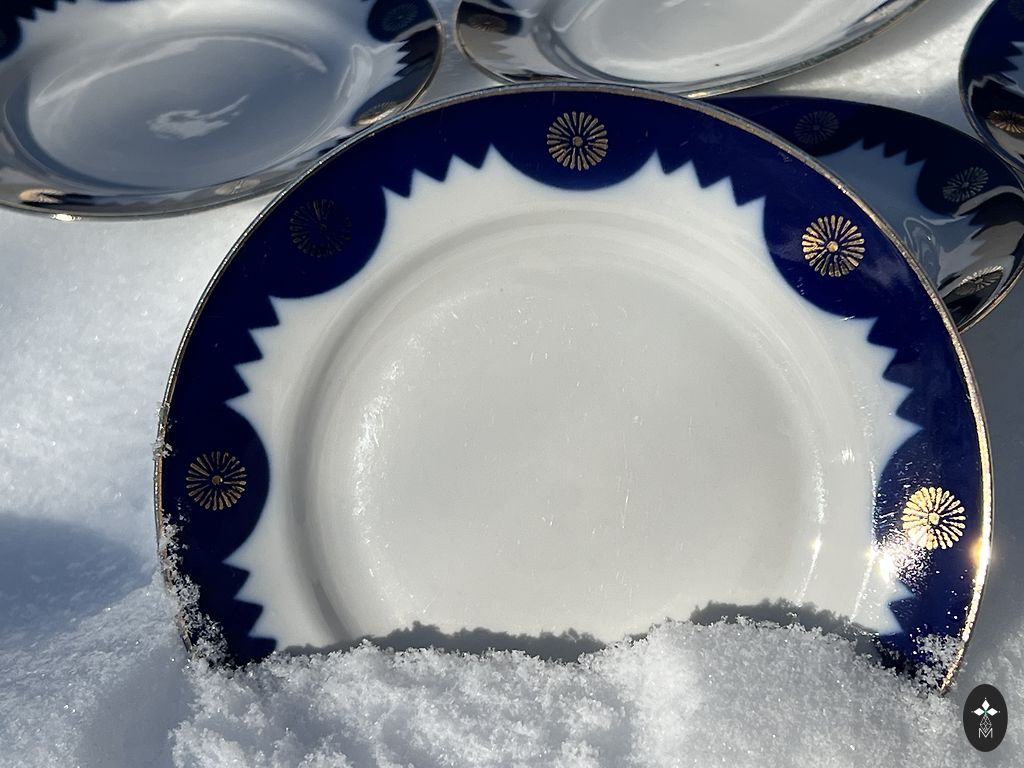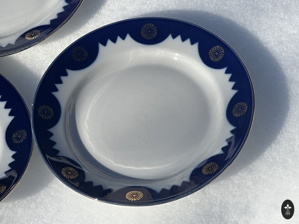 Nende aastate kohta ebatavaliselt suur tass (kõrgus 7,5 cm, laius 9,8 cm, maht 250 ml). Alustass 15 cm, magustoidutaldrik 19,5 cm.