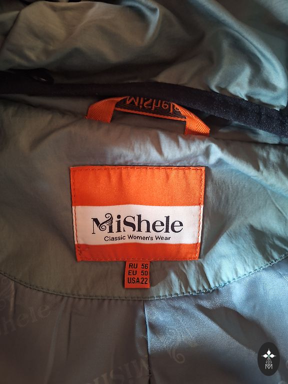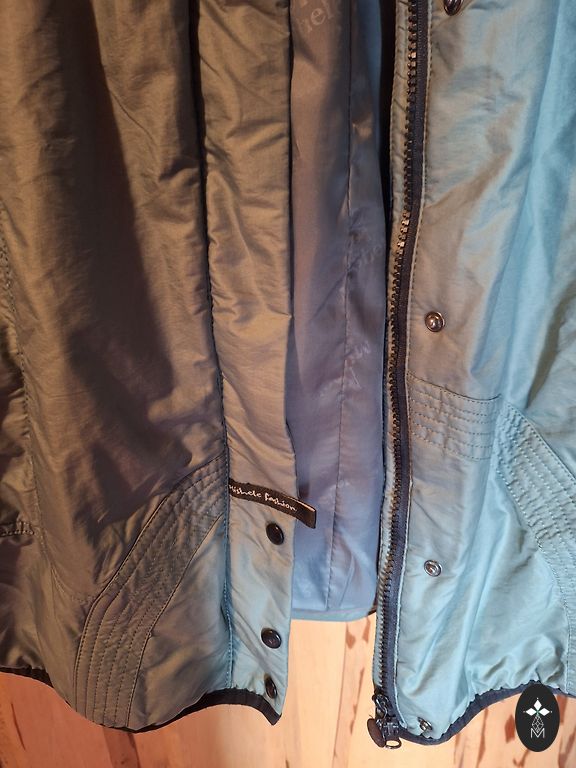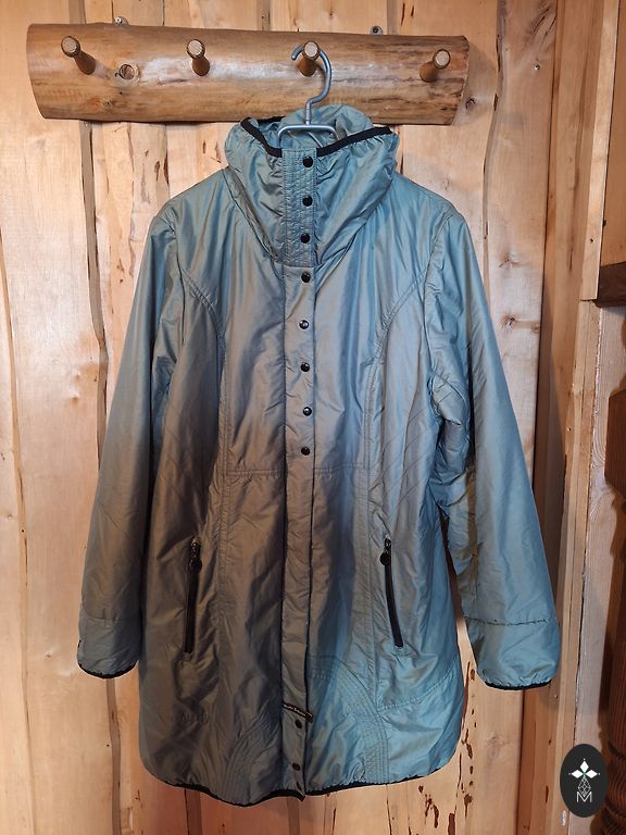Ilgis nuo uždaryto kaklo iki apačios 88 cm. Užsegimas su užtrauktuku, sagomis ir diržu. Priekinės kišenės su užtrauktukais. Kairėje pusėje vidinė kišenė. Rankovės su papildomu įsiuvu, kad nepūstų vėjas.