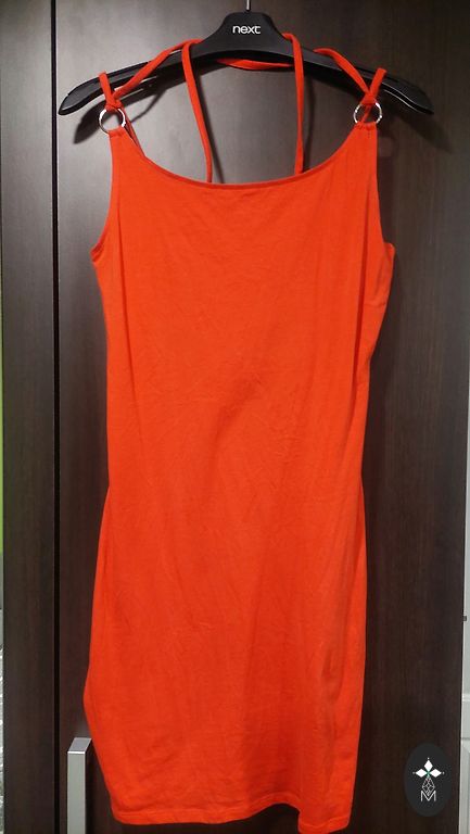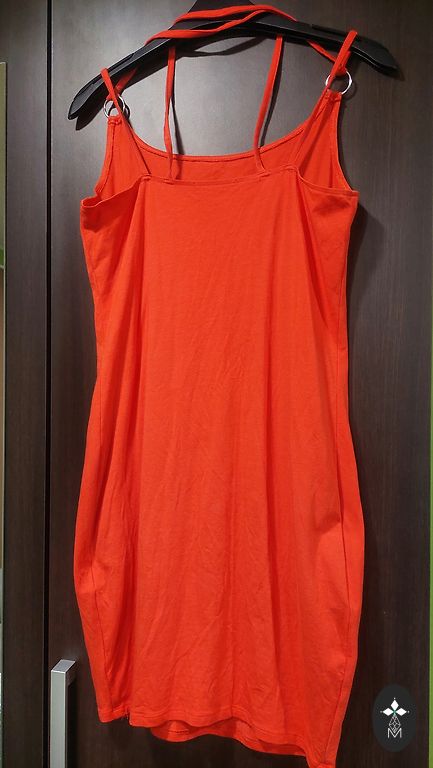 Pole tõmmatud. Ilus midi pikkusega kleit, lõhikuga ja külgedel seotava aktsendiga. Liibuv, kuid elastne.