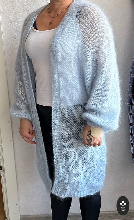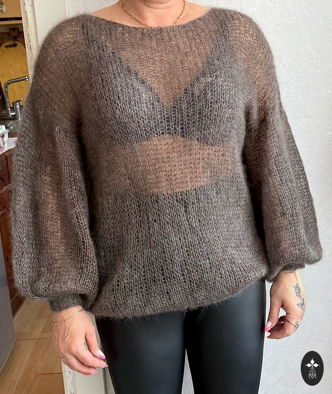 Megztinis įkvėptas „Free People“ – megztas mezgimo mašina. Siūlų mišinys: 50% merino, 20% angora, 25% akrilas, 5% elastanas. Spalva pilka melanža. Fotografuota įvairiomis šviesomis, kad būtų matomos siūlų atspalviai. Nugaros dalyje specialiai sukurta vertikali siūlė ir nuleisti pečiai – dizainui. Po megztiniu gerai atrodo baltas marškinėlis arba bazinės maikutės balta kraštinė. Numatyta dydis nešiotojai yra M, kad megztinis nebūtų prigludęs. Išmatavimai išskleistame stovyje ant stalo: Rankovių ilgis nuo kaklo iškirpimo iki rankovės apačios = 74cm Nuo peties iki peties: 41cm Nugaros ilgis nuo kaklo iki apačios: 66cm Krūtinės apimtis pusė: 56cm Riešo apimtis: 21cm Rankovės apimtis (prie pažastų): 34cm Kaklo iškirpimo plotis: 20cm Kaklo iškirpimo gylis: 10cm