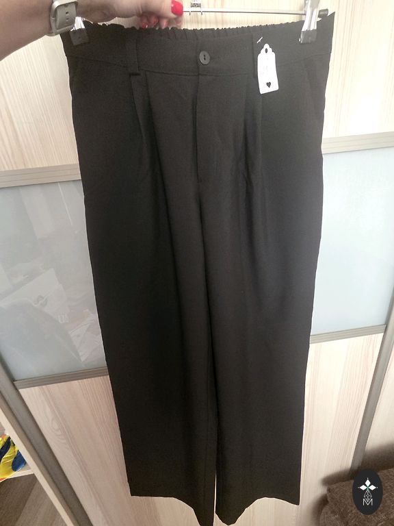 Juodos Chloe išeiginės kelnės, šonuose užtrauktukas, kelnių galuose vidinėje siūlėje užtrauktukai, smėlio spalvos pamušalas, šonuose atlaso įsiūvė per visą ilgį, siaurios su normaliu juosmens aukščiu, ilgis nuo klyno 70 cm, juosmens plotis 40 cm, klubų plotis 50 cm, 38 dydis EU, 40 dydis FR