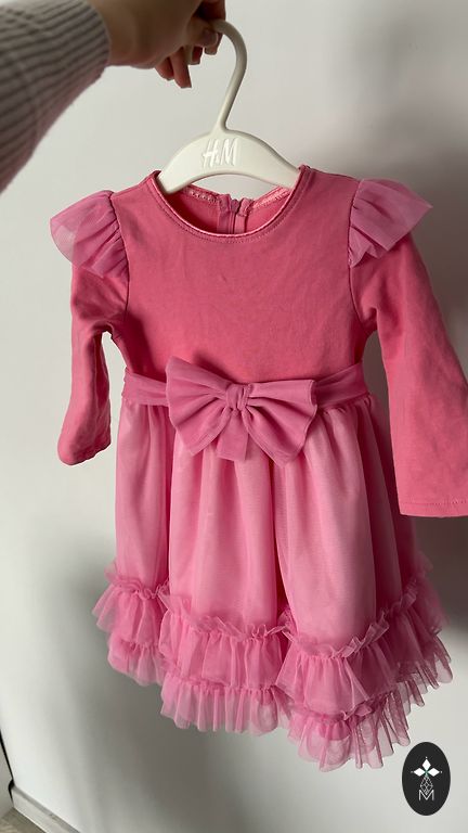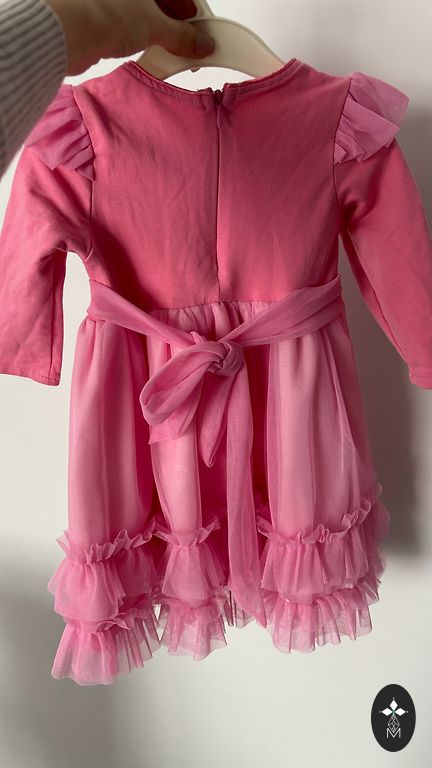 Mėlyna suknelė su aksominėmis gėlėmis. Nurodytas 104 dydis, bet mes dėvėjome iki 100 cm.