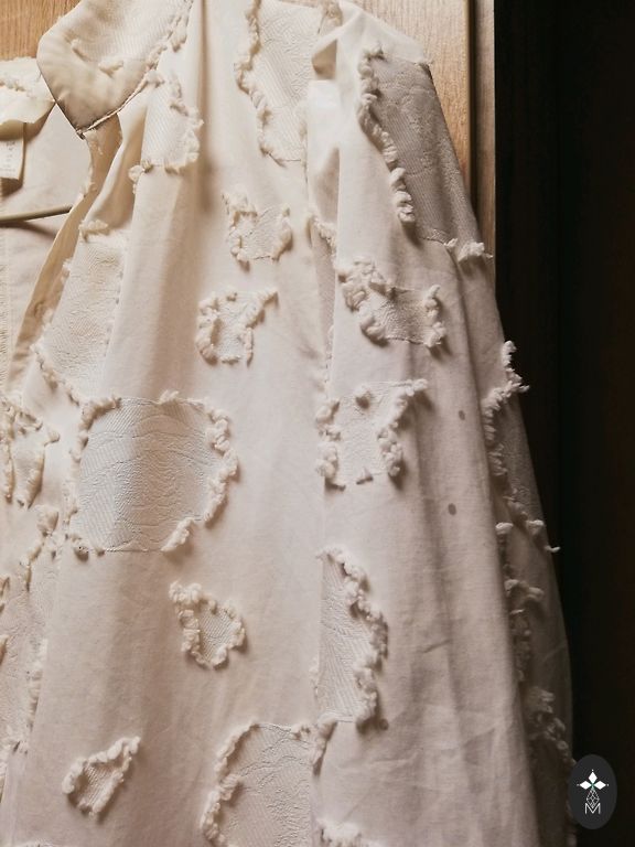 Ļoti skaista balta satīna kleita, pilnībā izšūta ar pērlītēm.