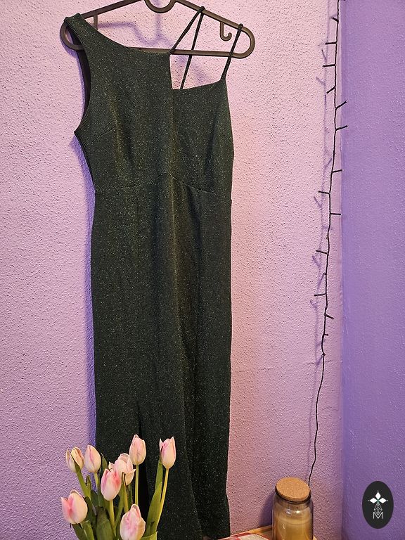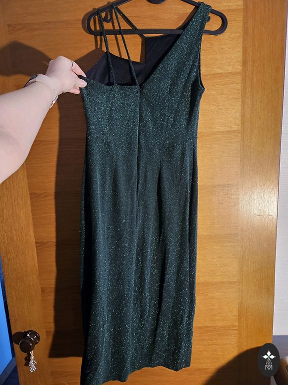 Pidulik, kuid mugav ja elastne minikleit. Tumeroheline kuldsete sädelevate kaunistustega. Kantud 1x uusaasta pidustustel.