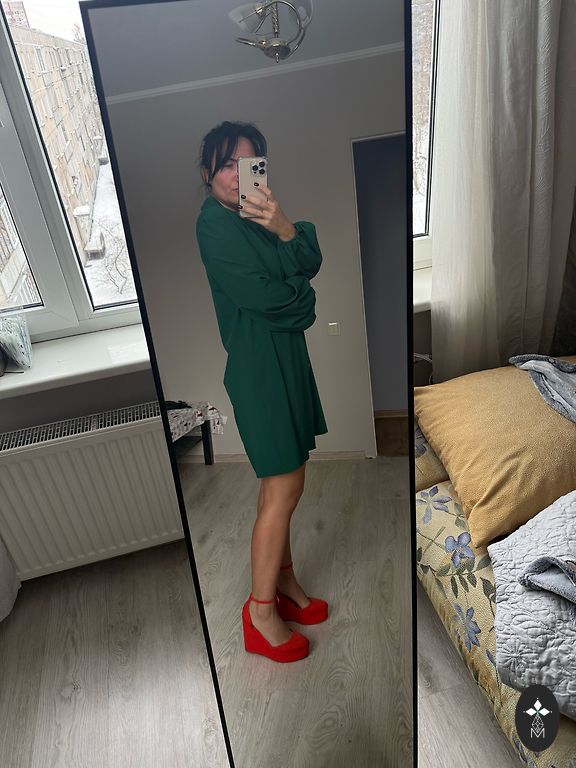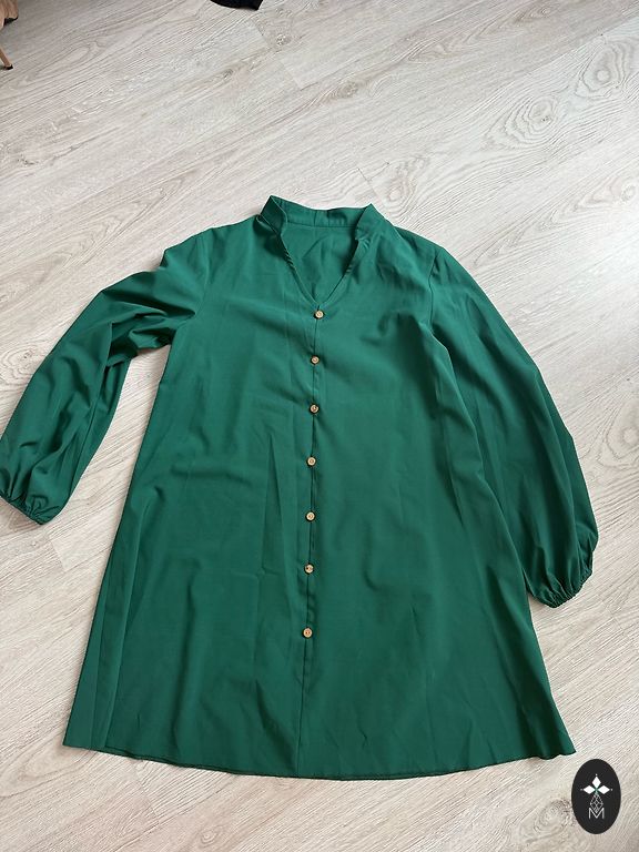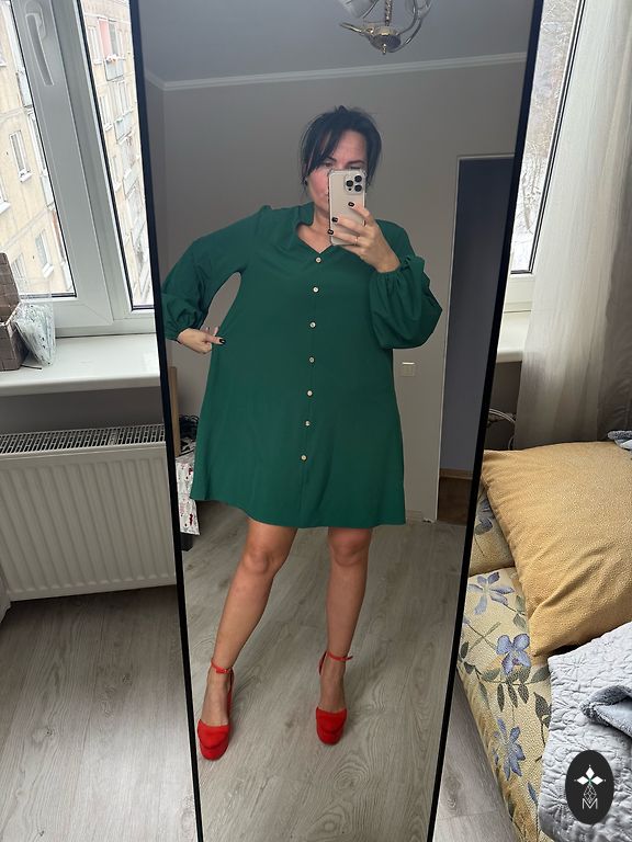 Pārdodu pieguļošu, tumši zaļu, spīdīgu kleitu (krāsu labāk var redzēt otrajā attēlā). Derēs cilvēkam ar 38 izmēru, iespējams arī 36 izmēra aprisēm. Kleita man (170cm) sniedzas pāri celītim, nesasniedz ikru vidusdaļu. Priekšā ir neliels šķēlums sānā. Vilkta laikam vienreiz, pārāk ilgi stāv skapī, lai atcerētos.