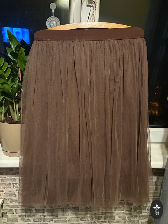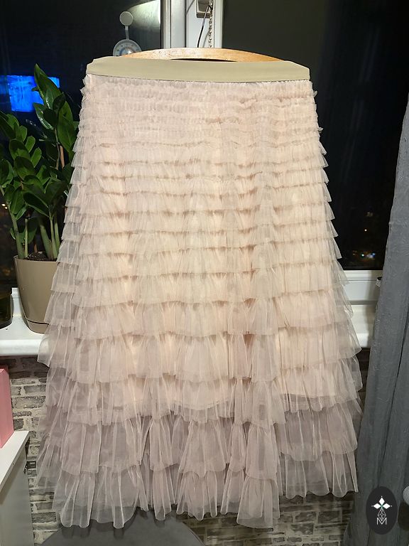 В области бедер узкие, ниже пышные и воздушные, ткань слегка шуршащая. Есть несколько слоев: подкладка, тюль и верхняя ткань с кружевом по нижнему краю... очень женственно. Сзади застежка на пуговицы и молнию. Спереди длина 70 см, сзади 84 см, талия 37x2 см. Куплены на распродаже, к сожалению, я уверен, что размер S.