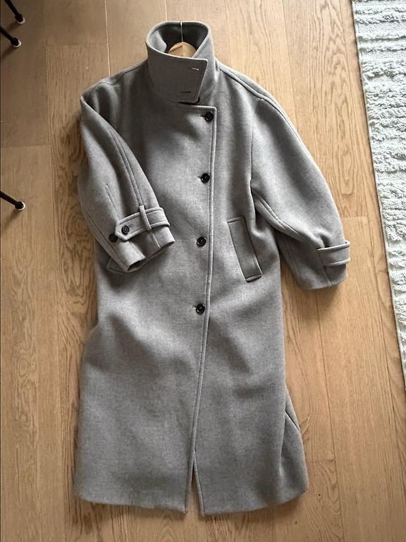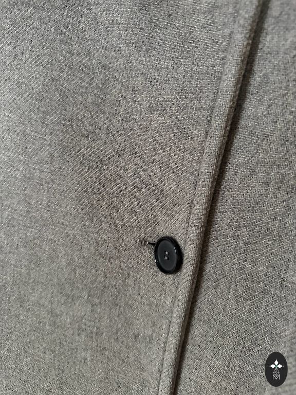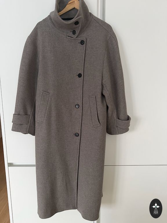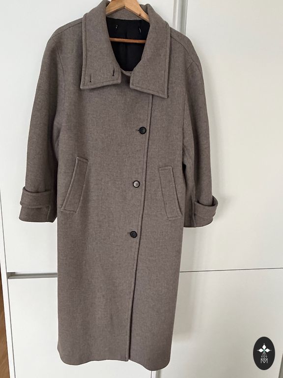 Pirktas čia, deja, per mažas. Ilgis 85 cm, nuo peties iki peties apie 40 cm, krūtinė apie 46 cm. Sudėtis 80% vilnos, spalva gyvenime šiek tiek tamsesnė. Yra kišenės.