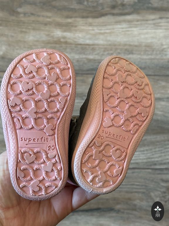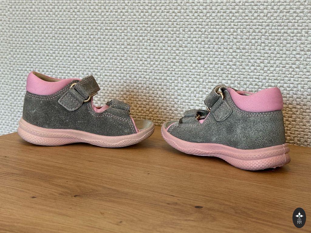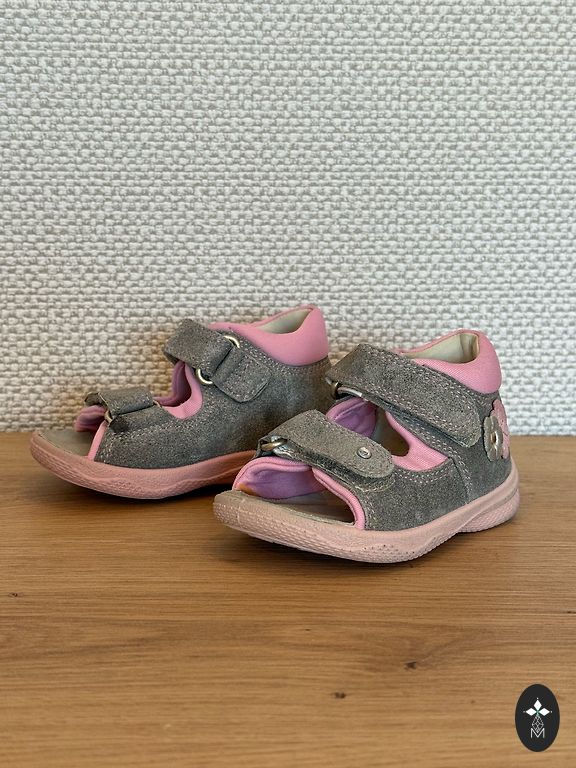 Ādas sandales pirmajiem soļiem, 19.izm. (11,7cm iekšpēdiņa), ļoti ērtas. Līplentes lieliskā stāvoklī. Ir tikai vizuāli defekti, jo nesājām visu vasaru uz basām kājām.