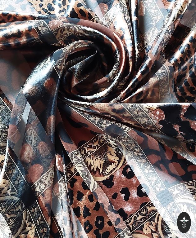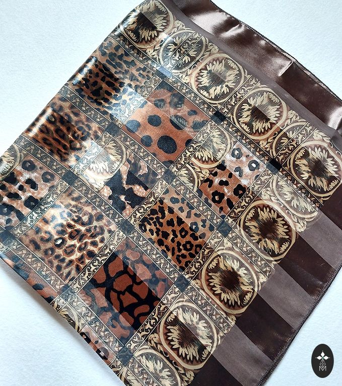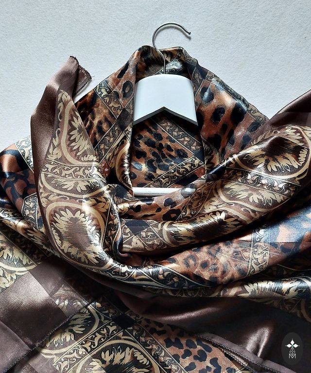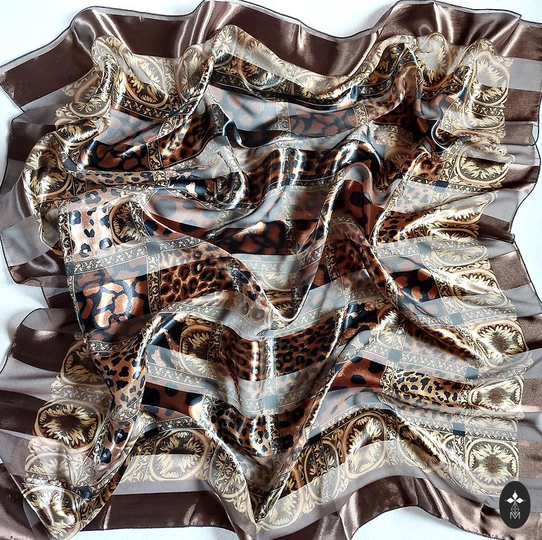 Nenaudojamas skara be trūkumų su leopardais, gyvūnų spauda šiltuose auksiniuose ruduose atspalviuose. Minkštas ir malonus liesti, panašus į dirbtinį šilką. Vidutinio dydžio. Puikus akcentas tiek prie švarkų, tiek prie paltų.
