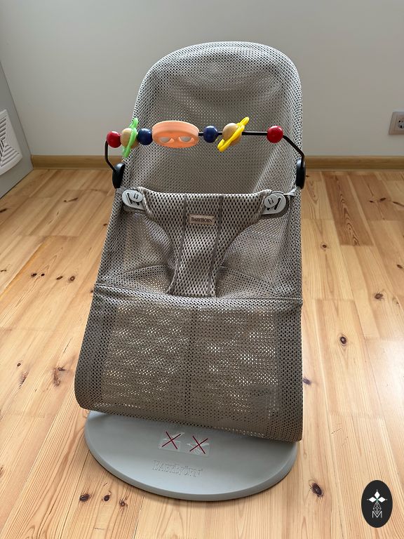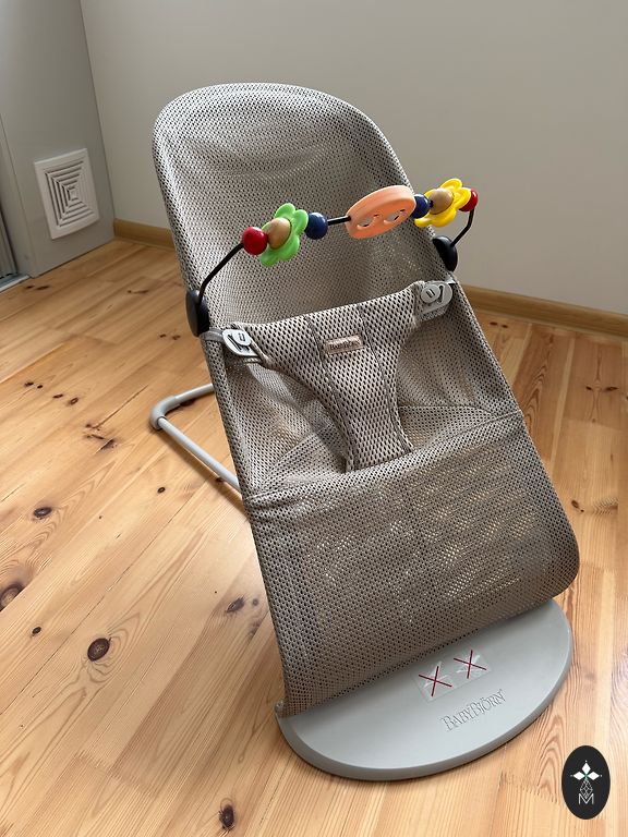 Babybjorn šūpuļkrēsls ar oriģinālo rotaļlietu, viss vesels labā stāvoklī, audums bez netīrumiem un bez defektiem, nav izbalējis vai noberzts.