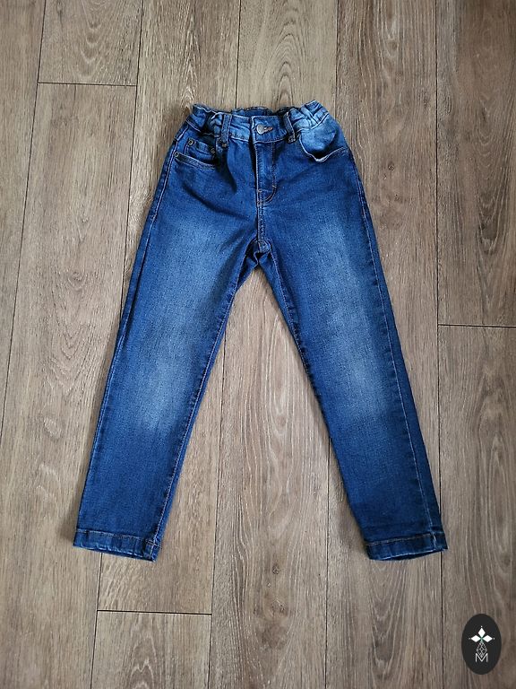 3 GB Lindex kelnės su reguliuojamu juosmeniu. Etiketėje nurodytas 116 dydis. Tamsiai mėlynos spalvos šiek tiek nusitrynęs raštas.