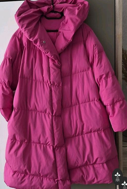 Ryškus, minkštas ir šiltas pavasario paltas su gobtuvu. Spalva labiau fuksija nei rožinė. Labai gaivina. Dydis universalus. Krūtinės ir klubų apimtis maks. 140 cm, bet gražiau iki 130 cm. Ilgis 100 cm. Nėra sintetikos. Vilna ir viskozė. Puikiai tinka pavasariui. Gerai atrodo tiek didesniam, tiek mažesniam dydžiui. Pagaminta Italijoje.