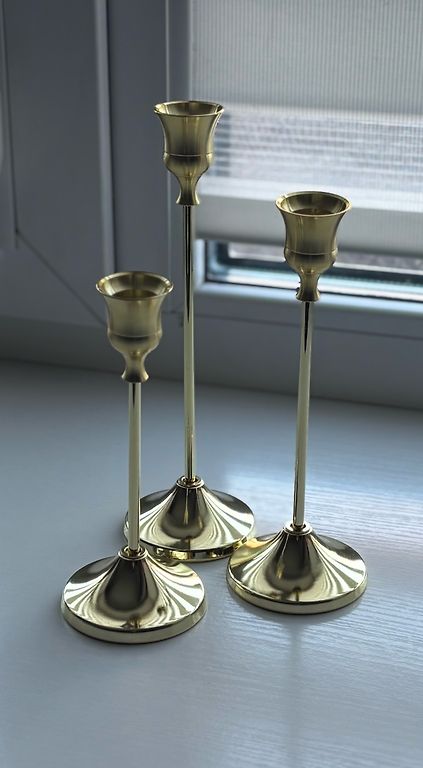Golden-colored candlesticks. Lightweight — not metal. One candlestick has chipped paint, others are in very good condition, possibly a small scratch.