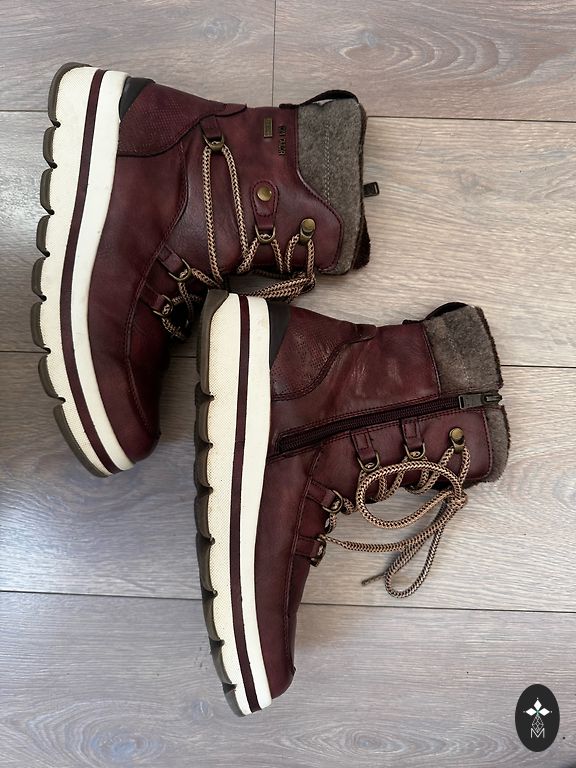Zabaki kā jauni, vilkti vienu reizi. Lietošanas pazīmju nav. Ārpusē 100% zamš, iekša mākslīgs siltinājums - kažociņš. Platformas zole ap 3cm. Sūtu.