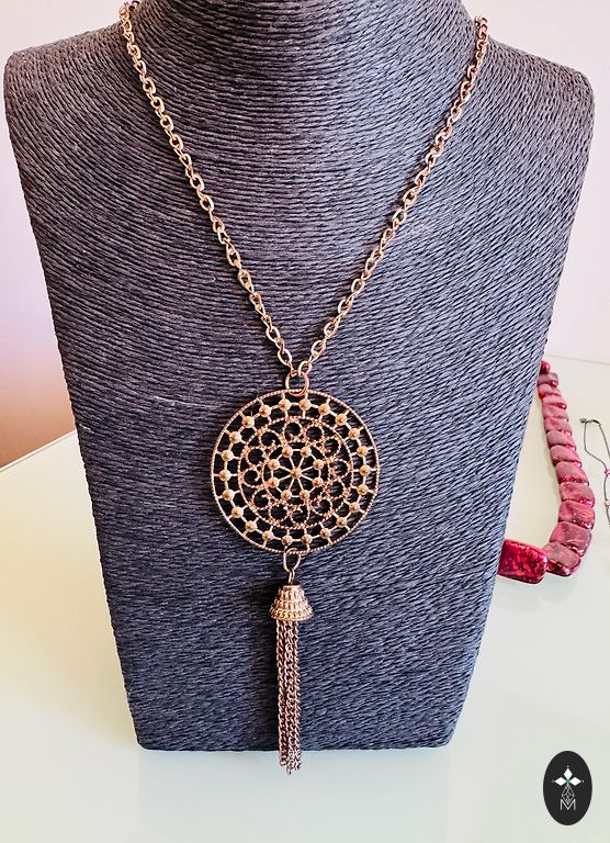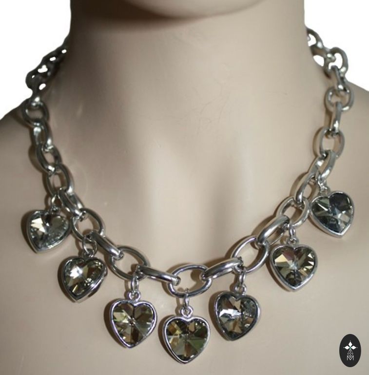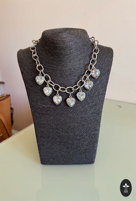Interesanta dizaina komplektiņš- kaklarota un auskari ar zaļiem kristāliem. Metāls ar sudraba krāsas pārklājumu.