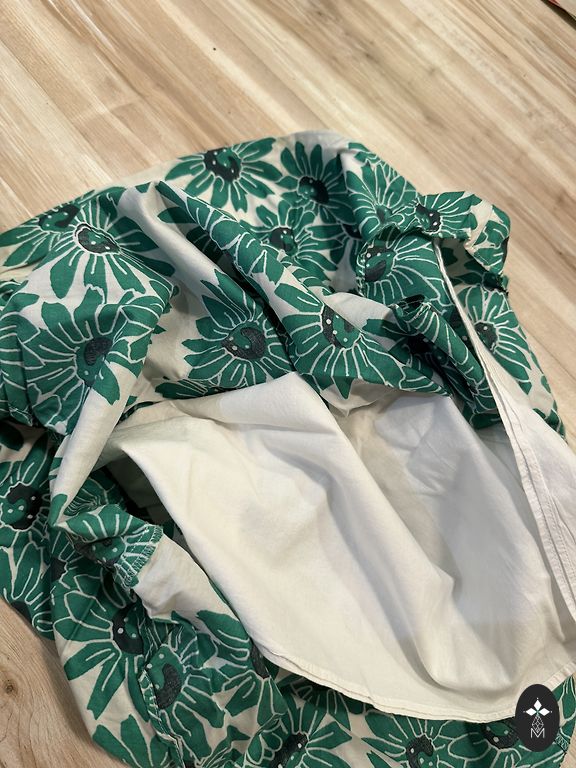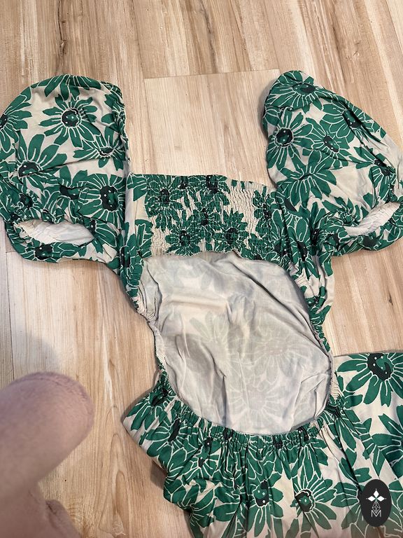 Kokvilnas kleitiņa ar pusgarām piedurknēm. Ļoti skaista un patīkama ādai. No mīnusiem - mazs balts nodilumiņš priekšā (redzams bildē). Bet kārtīgi neieskatoties, pat īsti nevar redzēt - liekas kā daļa no raksta
