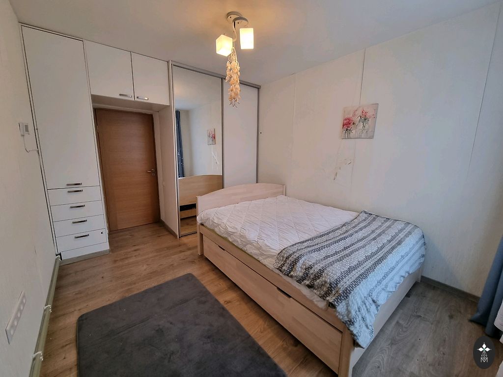 Отличная двуспальная кровать из дерева, произведенная в Латвии. Рама рассчитана на матрас размером 180x200 см. Под кроватью ящик для вещей размером 155x94 см. Высота кровати 35 см, высота изголовья 74 см.