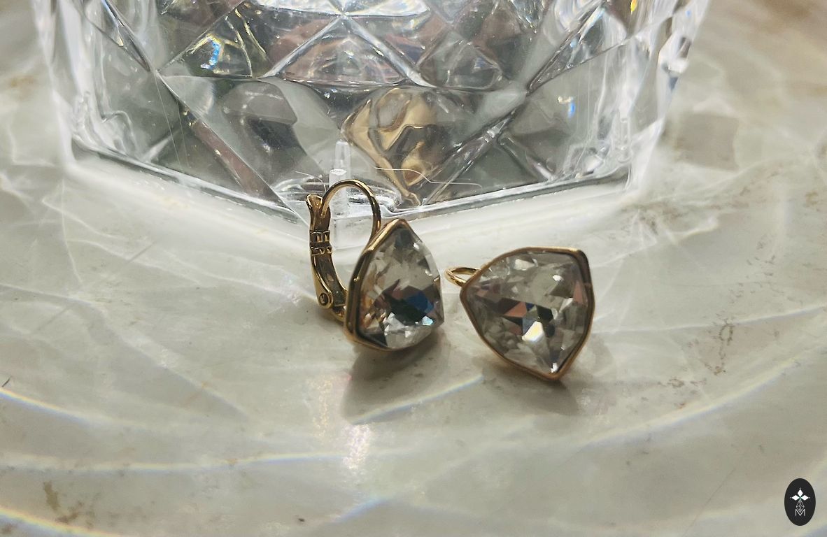 Маленькие серые серьги Swarovski. На ножке серьги дефект — немного отошло позолоченное покрытие.