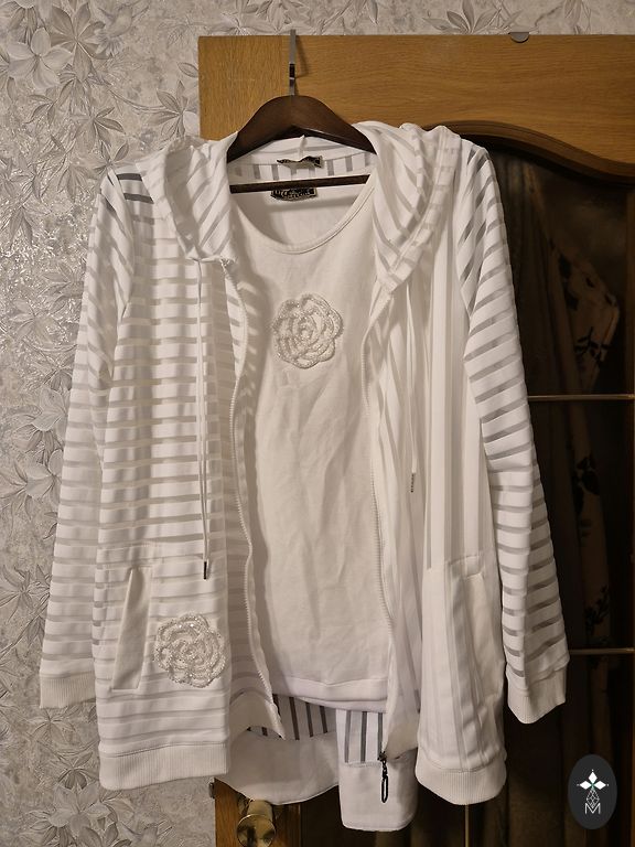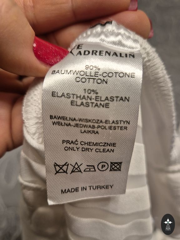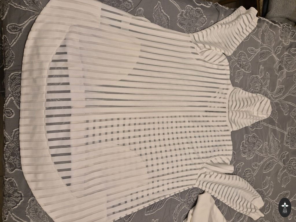 Ткань похожа на мужские рубашки, но с лайкрой. Хлопок тонкий. Украшения проколоты и не выпадают. Нижний край асимметричен. Боковые карманы. Размеры: обхват груди 130 см (не растянутый), растягивается до 140 см. Бёдра 140 см. Длина 110 см. В отличном состоянии. Цвет: ярко-красный.
