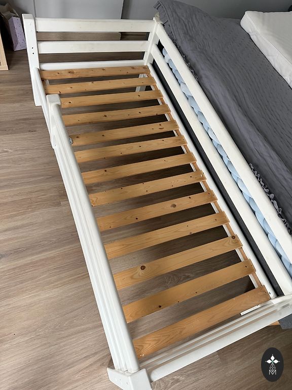 Puidust voodi koos madratsiga. Mõnes kohas on kriimustusi. Kleebised eemaldan. :)