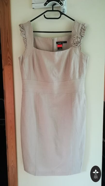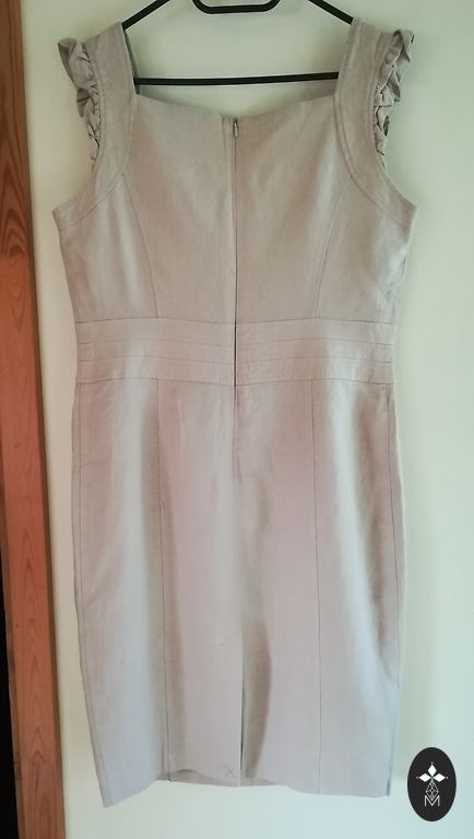 Jauna, mīksta un elastīga auduma (78% poliesters, 19% viskoze, 3% elastāns) kleita bēšā krāsā. Nav caurspīdīga. Rakstīts L izmērs, bet pēc mēriem labāk derēs M vai S izmēriem. L izmēram būs ļoti pieguļoša. Mēri: garums 88 cm, platums plecos 39 cm, apkārtmērs zem padusēm 44x2 cm, viduklī 40x2 cm, gurnos 47x2 cm, piedurknes 65 cm.