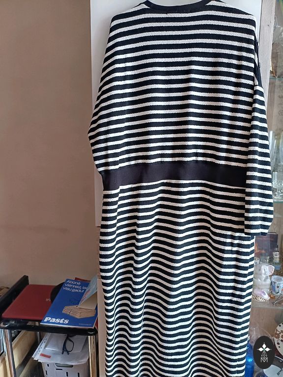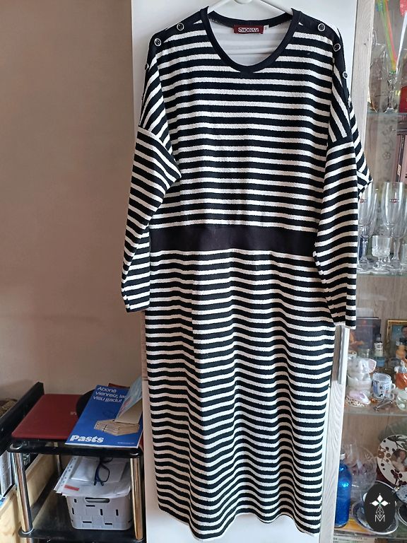 Ar oderi, kabatām, 1 poga, bet esmu iešuvusi slēptās spiedpogām kā sev. Tad sapratu, kā gurnos man ir pašaurs. Krūtis 66, gurni68, garums118, roka 62cm