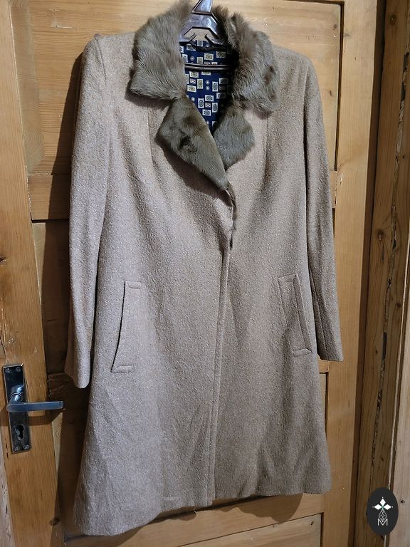 Šviesiai rudas, labai lengvas ir minkštas paprasto kirpimo paltas.