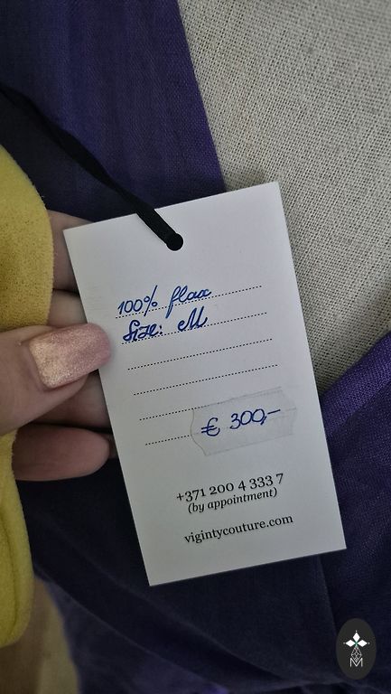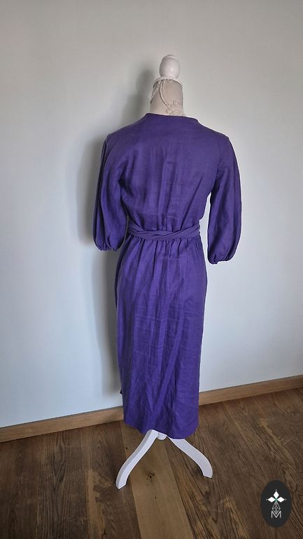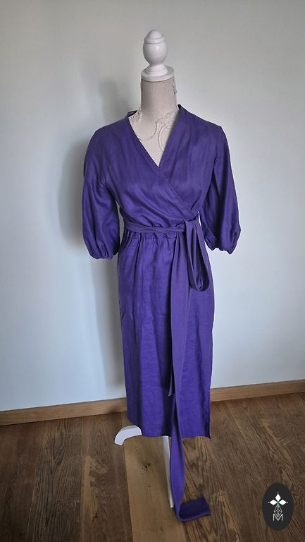Riktīgi smuka lina kleita, kā radīta mūsu vasarai vai spilgtām silto zemju ceļojumu atmiņām. Kleita ir uzmērīta, jauna. Garums no apkakles ap 90cm, krūtīs ap 58, tālāk jau aiziet platumā un bruncītī. Apdruka sietspiedē. Oriģināldarbs.