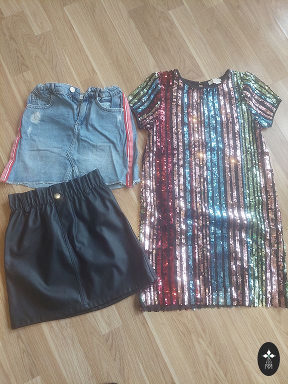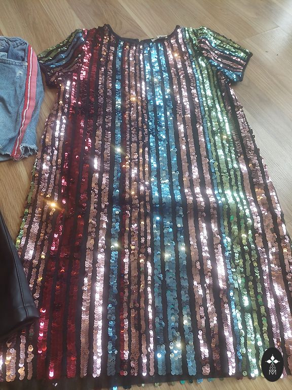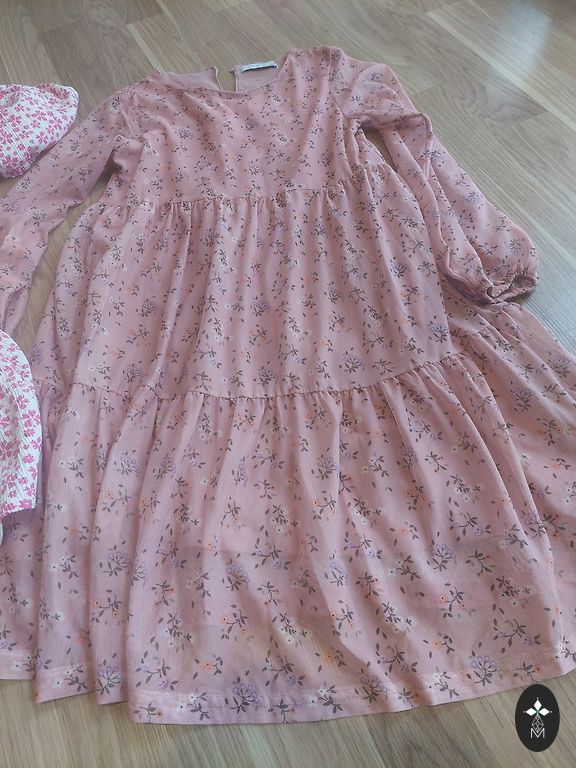 Suknelė su raišteliais, leidžianti reguliuoti dydį. Specialiai siūta.