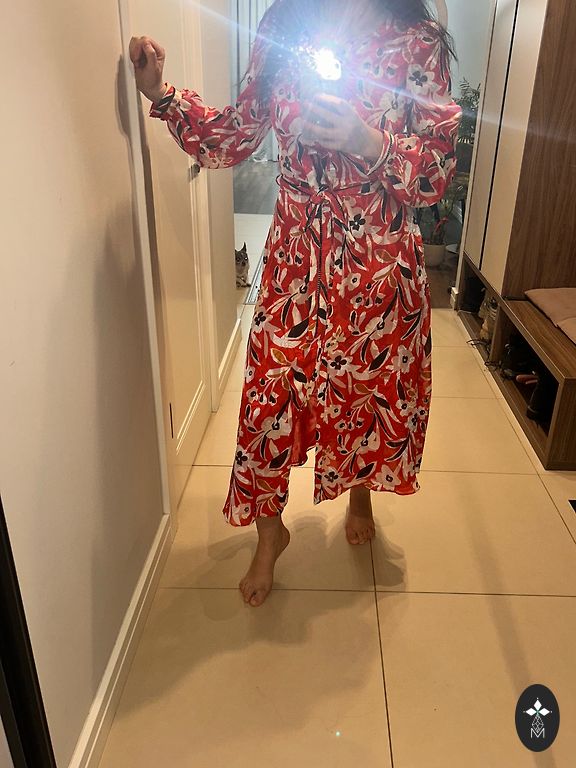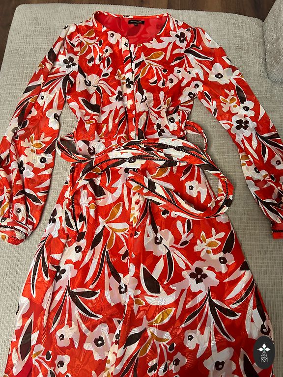 Parduodu labai gražią ryškią suknelę su skeltuku. Šilko tipo medžiaga. Dekoratyvinės sagos ant vienos pusės. Reguliuojamos petnešos ir paslėptas užtrauktuko užsegimas vienoje pusėje. Tiks S/m dydžiui.