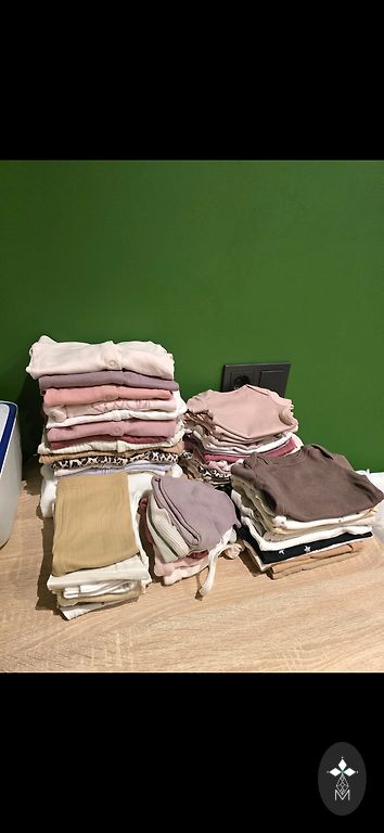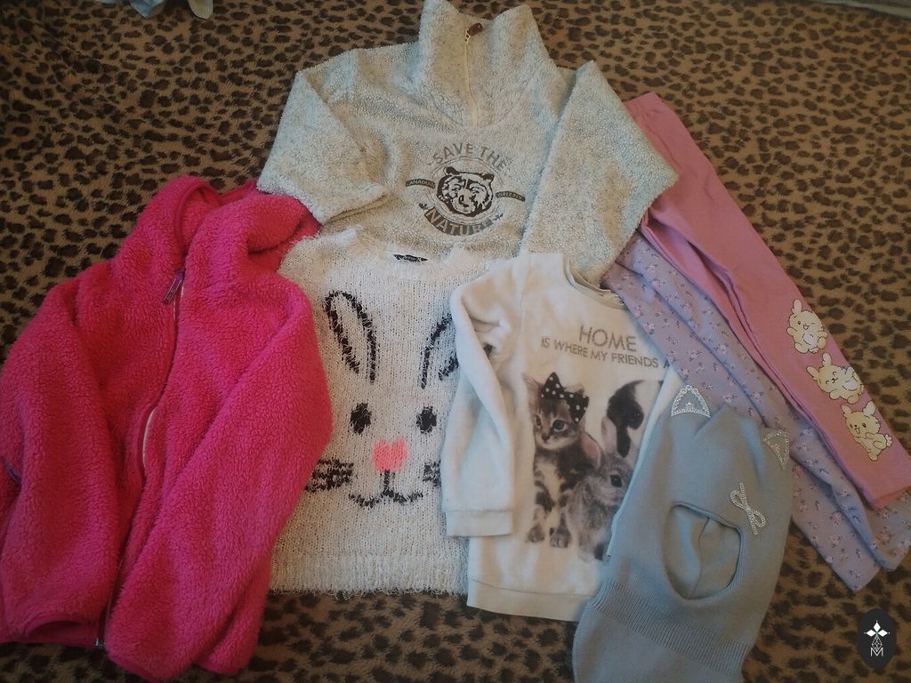 8 poros šortų: dydžiai įvairūs nuo 122 iki 134, vieni taip pat 140 cm. Prekių ženklai: Okaidi, Polarn O. Pyret, Gap, H&M. Gėlėti šortai dėvimi iš abiejų pusių. Marškinėliai: nurodyti dydžiai 8-9 ir 8-10 metų, 134 ir 134/140 cm.