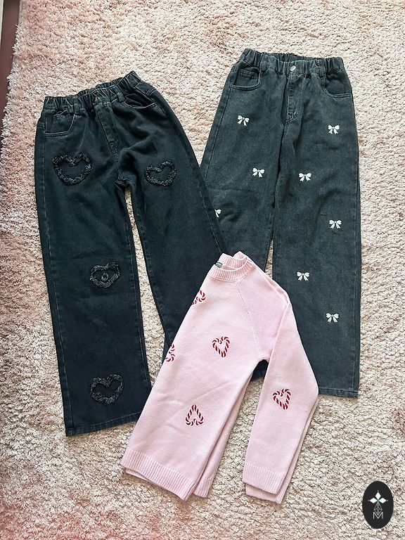 Plonos vasaros kelnės: įvairių dydžių, bet mano vaikas dėvėjo tuo pačiu metu. Pilkos kelnės su guma: išorinė siūlė 74 cm, vidinė siūlė 51 cm. Dryžuotos kelnės su diržu: išorinė siūlė 85 cm, vidinė siūlė 56 cm.