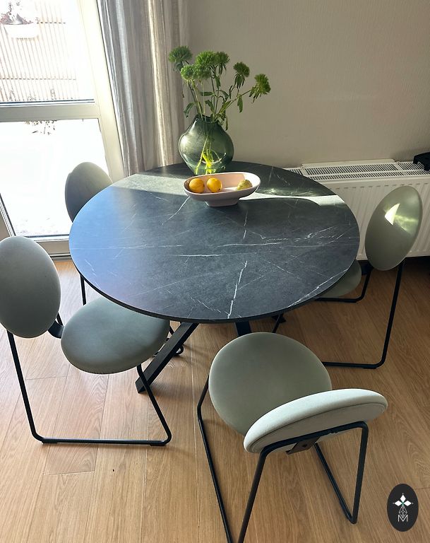 Apaļš galds ar mīkstām apmalēm telpai piešķir brīvu, nepiespiestu atmosfēru.