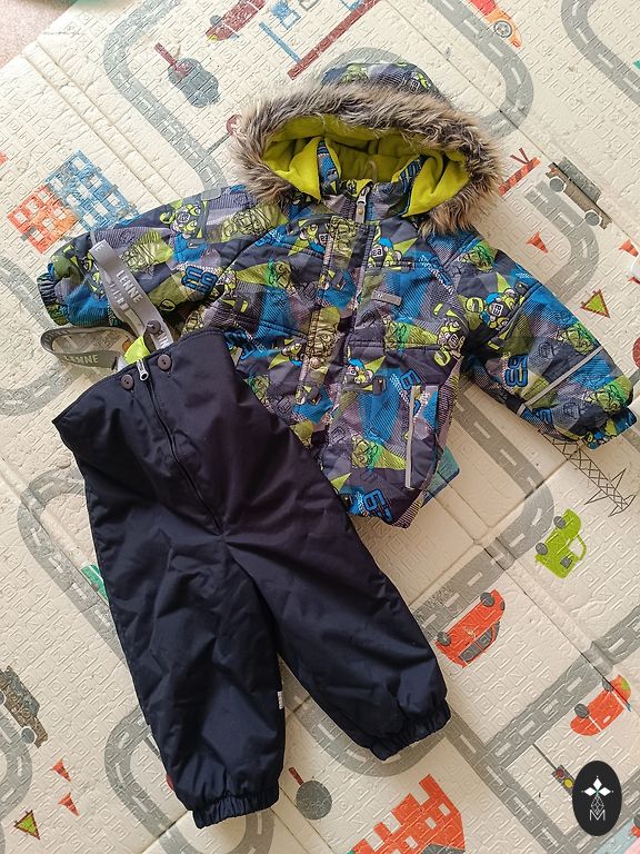 Vaikiškas žiemos kombinezonas su Batman audiniu išorėje, viduje minkštas kailiukas. 80 cm.